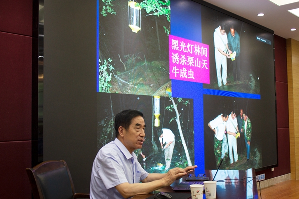 报告会上,杨忠岐教授首先饱含深情地回顾了自己在母校的求学经历,分享了自身工作学习历程,表达了对母校的深厚情感,同时也对即将到来的母校九十年华诞表示诚挚祝福。随后,他从生物防治入手,分析了近年来我国重要林木害虫的生物防治现状和以利用天敌昆虫为主的生物防治取得的一系列科研成果。他着重介绍了利用本土天敌白蛾周氏啮小蜂和HcNPV病毒防治美国白蛾的新技术、利用引进的捕食性天敌大唼蜡甲成功控制外来入侵重大害虫红脂大小蠹的技术、利用黑光灯、不育剂和花绒寄甲等天敌昆虫综合防治栗山天牛的技术、利用花绒寄甲成功防治危害泰山、孔府千年古槐的技术,人工合成饲料繁育椰心叶甲天敌技术、白蜡窄吉丁在美国的危害现状及天敌防治技术,以及利用花绒寄甲、川硬皮肿腿峰控制松材线虫病媒介昆虫松褐天牛的技术及其应用前景等。近3个小时的精彩分享,杨忠岐教授用生动活泼的现实事例,将理论与实践紧密结合,为相关领域的研究提供了新的思路和启示。
